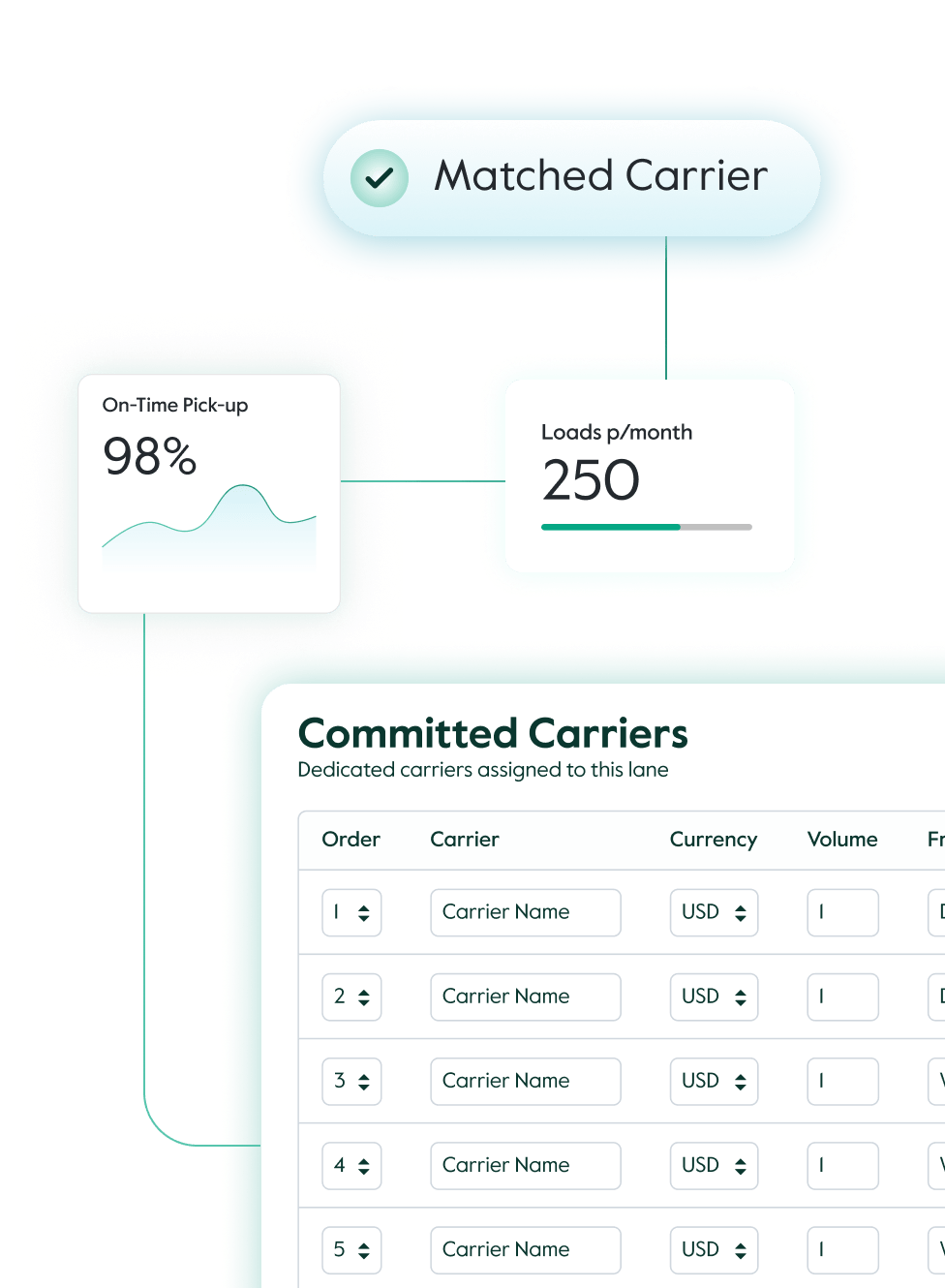 NuvoOS centralizes your rates, providing real-time market insights and aligning your pricing with profitable lanes. By understanding your offering, NuvoOS strategically places you in more routing guides, giving you priority access to high-demand lanes and preferred shippers. This ensures long-term relationships with key partners.